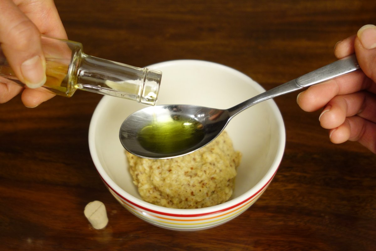 Zusammen mit den gemahlenen Mandeln und den Kokosflocken verrühren. Einen großzügigen Esslöffel Öl hinzugeben. Was ihr gerade im Haus habt, habe Olivenöl genommen. |
